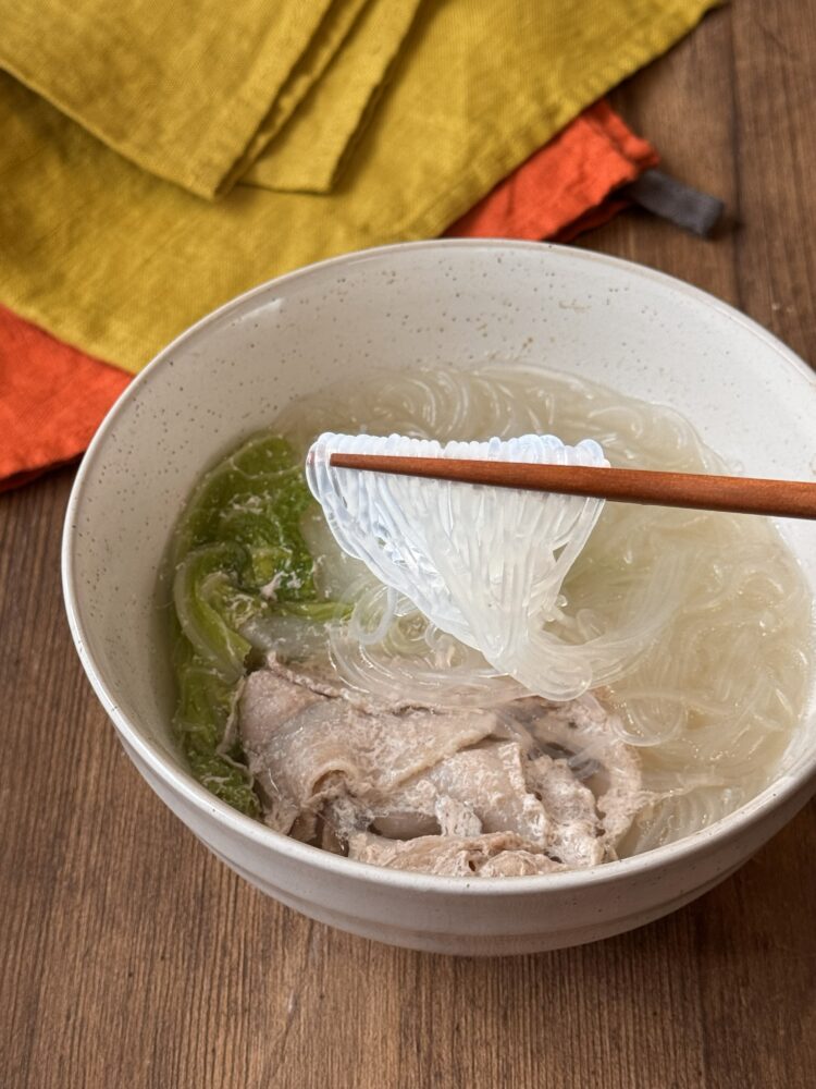 レンジで簡単!包丁なし9分で完成!豚こま白菜の春雨スープ。カロリー控えめでダイエットにもいい。